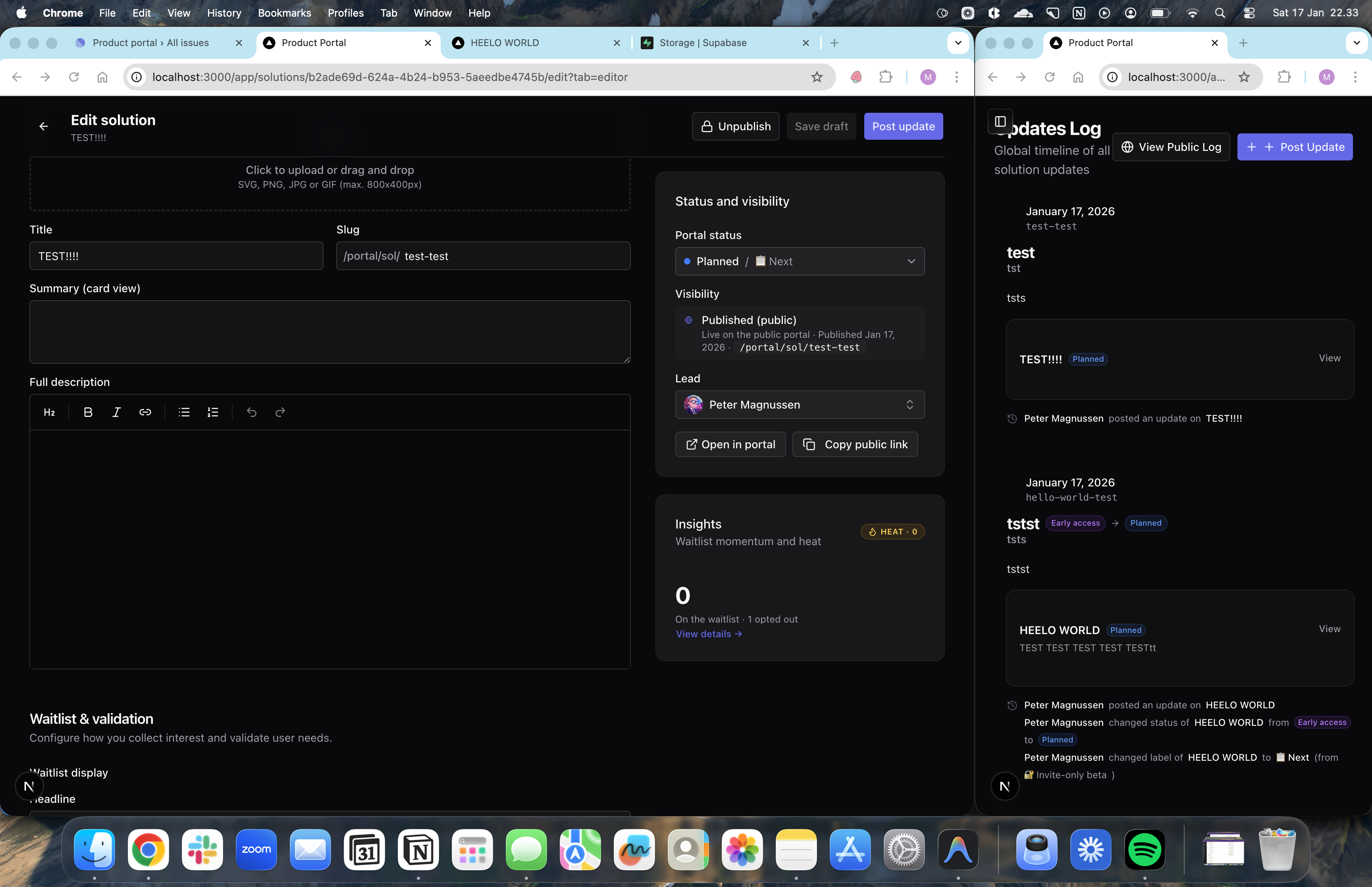 The Admin Portal is the PM's command center. It separates the public view from the management view, giving you a private space to draft, edit, and organize.